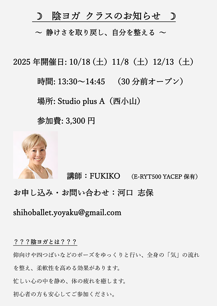 ● 2025年10月〜12月 陰ヨガクラスを開講します。詳しくはこちらをご覧ください。